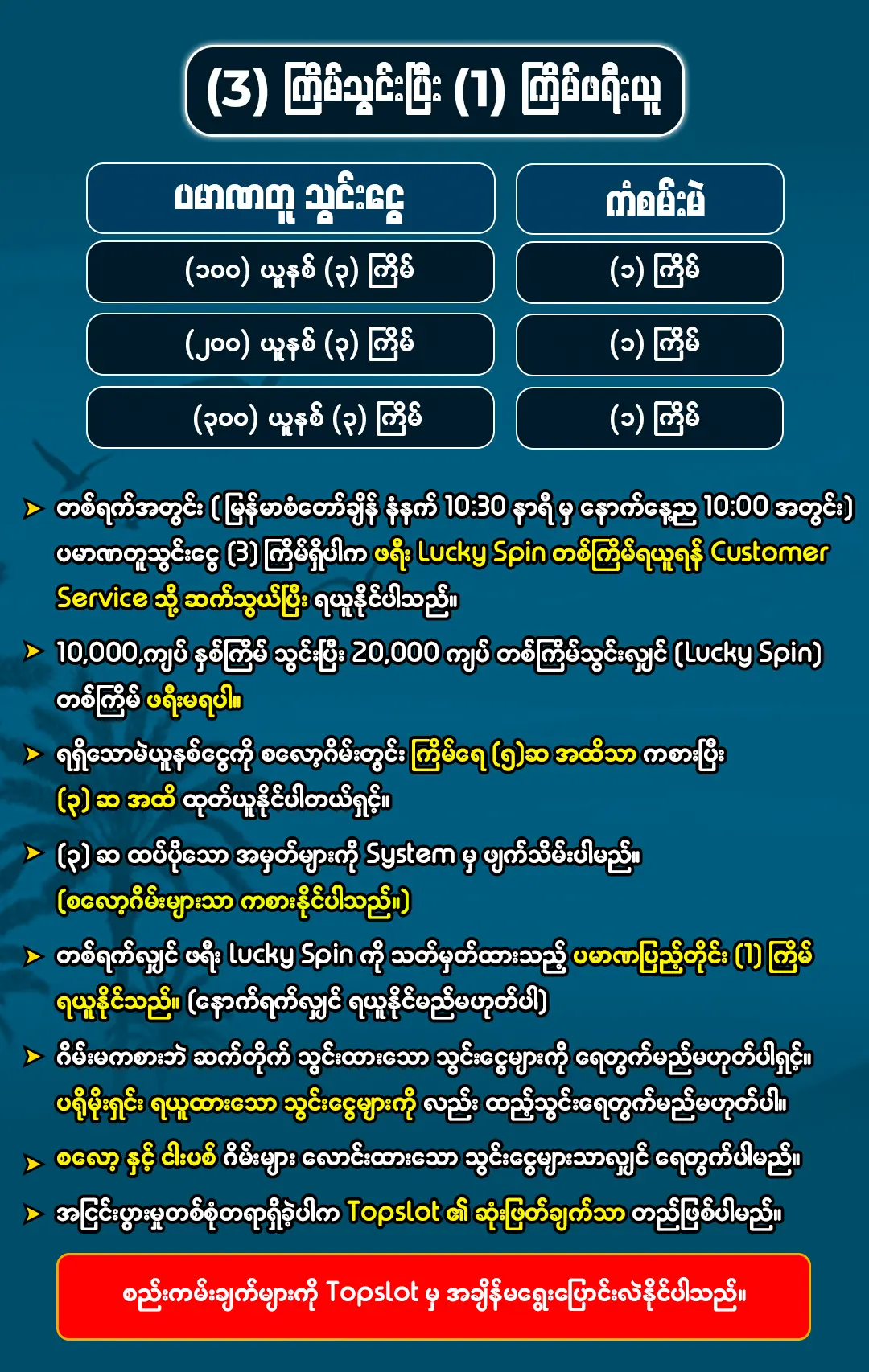 Spin (သို႔) Free Spin တစ္ခ်က္တြင္အမွတ္ {{ turnOverReward.together }} ႏွင့္အထက္ အႏိုင္ရရွိမွသာ ဆုစာရင္း ဝင္ပါမည္။