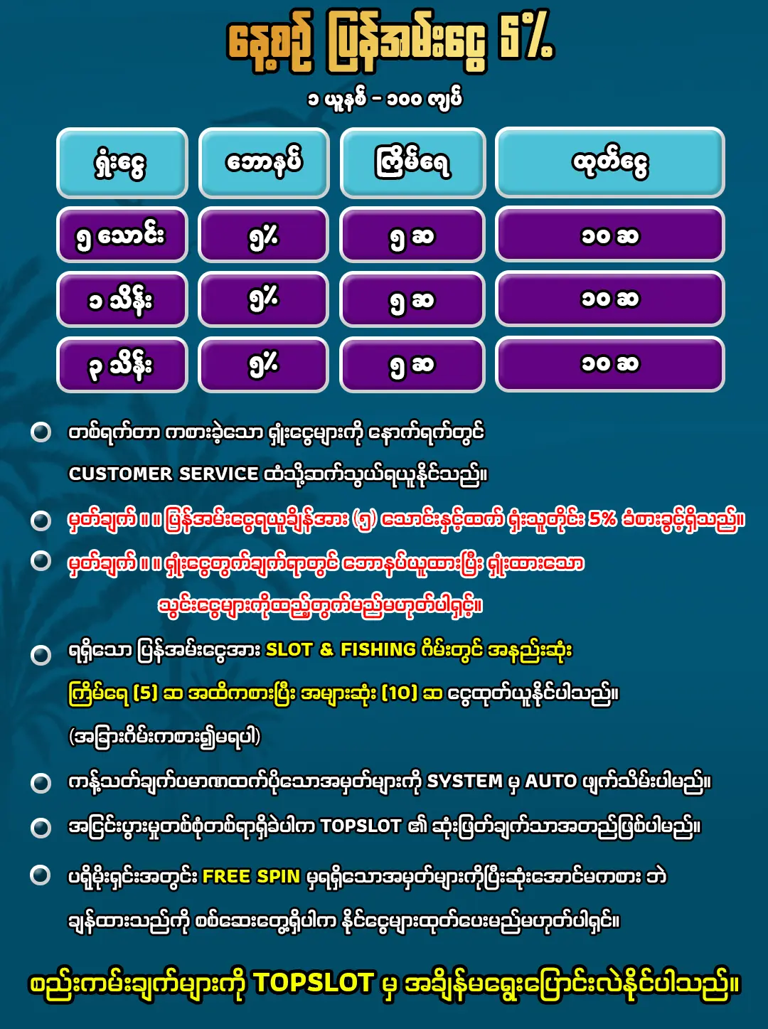 5. TOPSLOT မွ ဤပ႐ိုမိုးရွင္းအားအခ်ိန္မေ႐ြး ျပဳျပင္ေျပာင္းလဲပိုင္ခြင့္ရွိသည္။