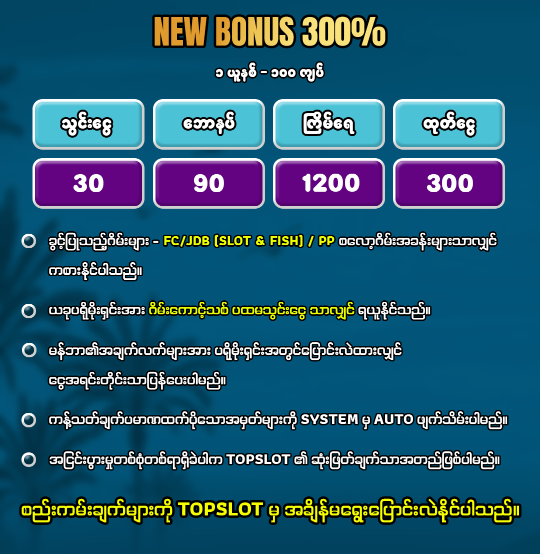 2. Slot ဂိမ္းအားလုံးတြက္ခ်က္ေပးပါသည္။(YGG ၊ ACE WIN မပါဝင္ပါ)အႏိုင္ရရွိေသာဆုမ်ားကို ႀကိမ္ေရတစ္ဆကစားၿပီးမွသာလွ်င္ေငြထုတ္ႏိုင္မည္။