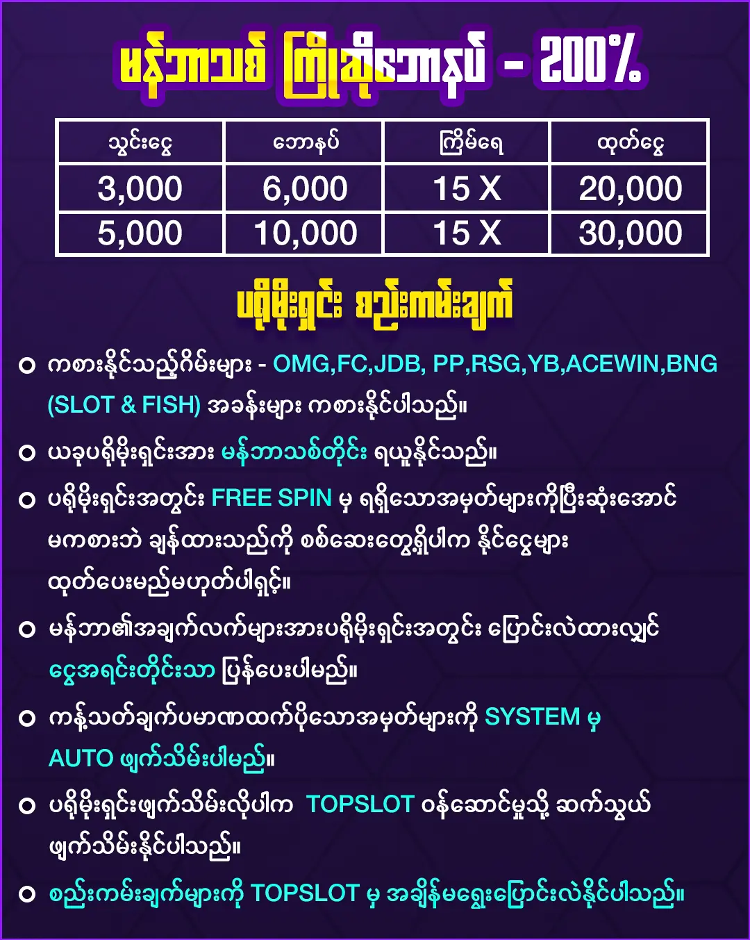 2. Slot ဂိမ္းအားလုံးတြက္ခ်က္ေပးပါသည္။(YGG ၊ ACE WIN မပါဝင္ပါ)အႏိုင္ရရွိေသာဆုမ်ားကို ႀကိမ္ေရတစ္ဆကစားၿပီးမွသာလွ်င္ေငြထုတ္ႏိုင္မည္။